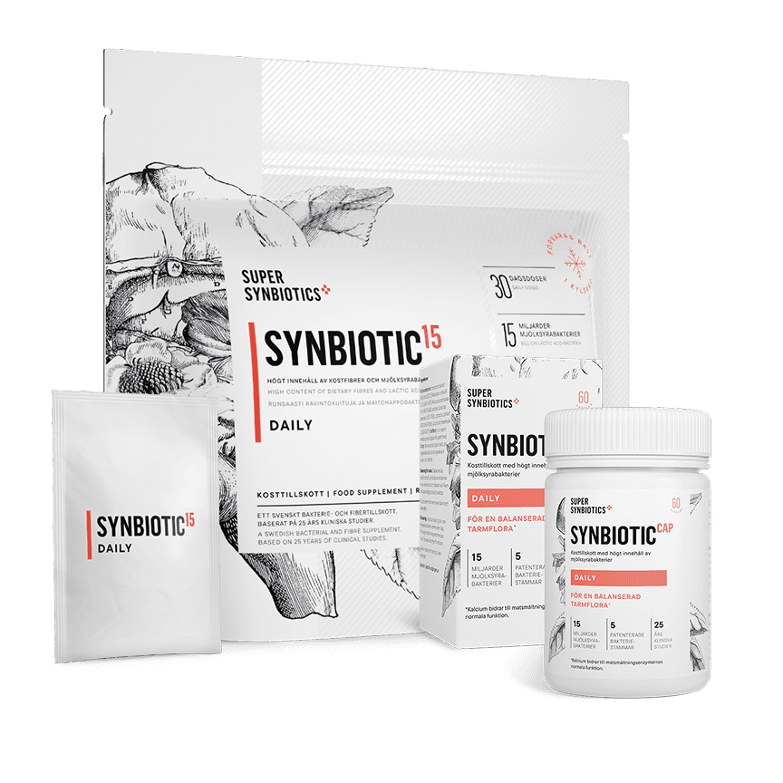 Synbiotic är en unik och patenterad komposition, med ett högt innehåll av mjölksyrabakterier och kostfibrer för en balanserad tarmflora.